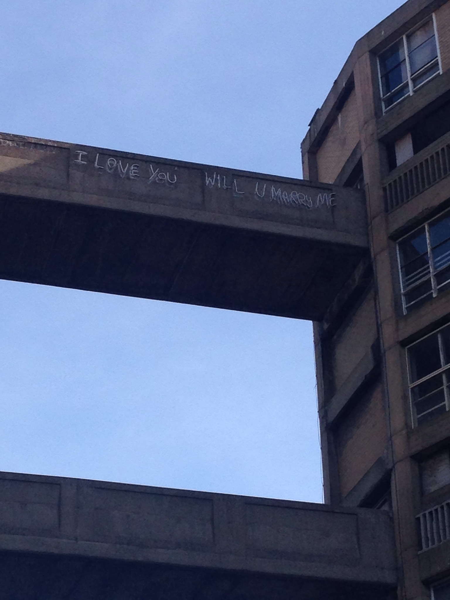 Unable to continue along the walkway to the empty block. We headed down the steps, out through a car park and down to the refurbished, occupied block, as owned and marketed by Urban Splash. We couldn’t get in, so instead wandered around its base, checking out the aluminium panels (yucky orange and reds, giving it a cheap and tacky aspect) and the ‘will you marry me’ graffiti, now immortalised in neon.