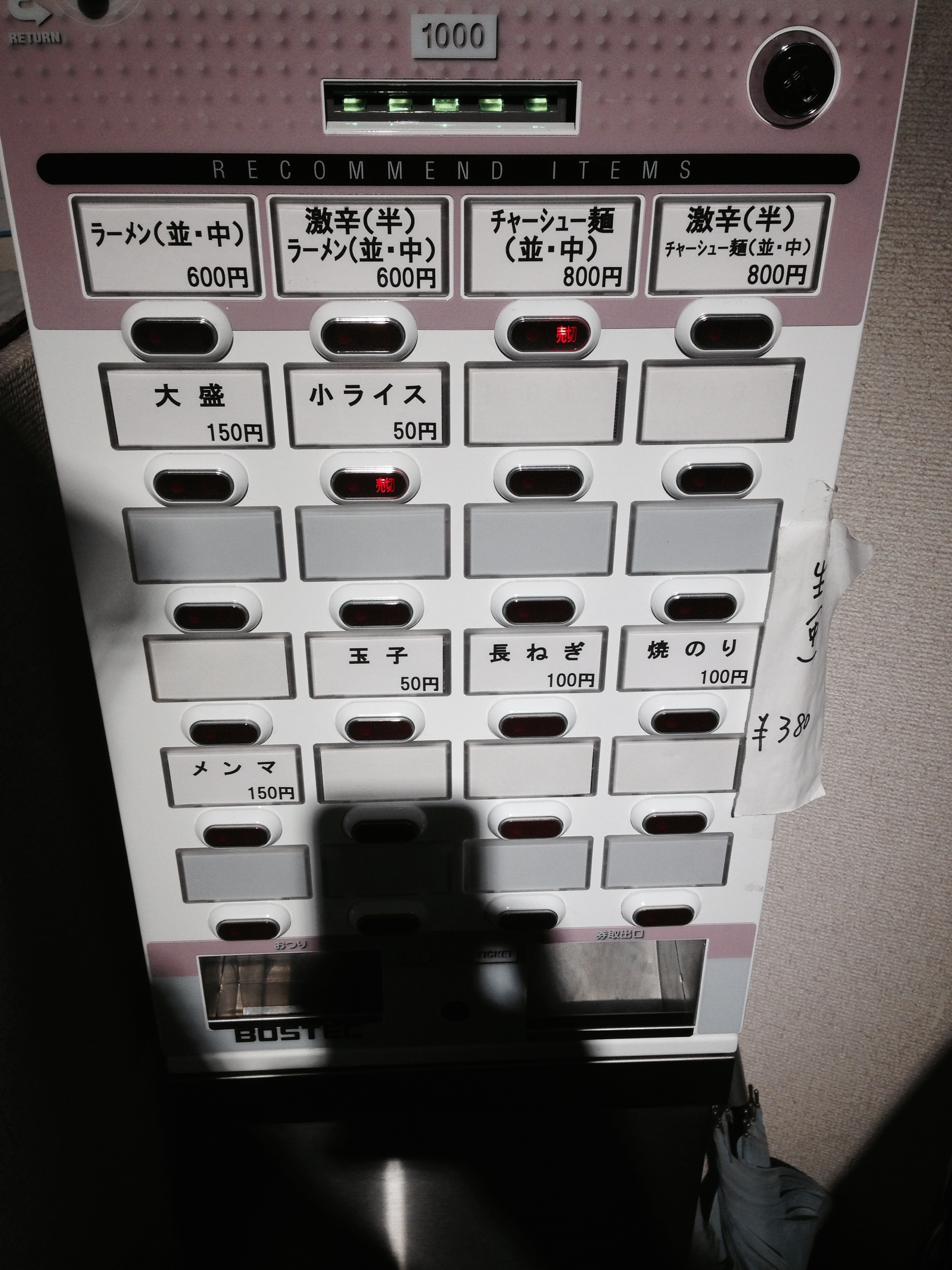 We made it inside, and the proprietress – in her late sixties, I would guess – immediately put a sign outside to deter further customers. As is customary, there was a machine with which you make and pay for your order, then handing your ticket to the staff. Who, in this case, were just two: the sign-wielding lady, and her grey moustached, ramen-wielding husband.