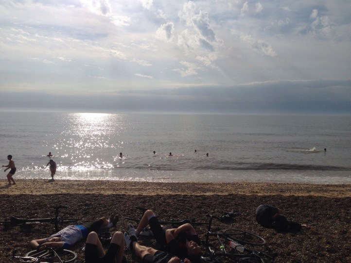 Another option is to barely sleep, then play cricket in the hot sun all day, before rushing to a friend’s house to pump up your tyres, doze for twenty minutes, then cycle hurriedly to the start point in the opposite direction to the hundreds of cyclists already making their way to the sea. It’s one of the best moments of the Dynamo: the glee of convoying out of London surrounded by thousands of other like-minded bewheeled souls, feeling that statistically negligible but confidence-boosting safety in numbers, to the intense confusion of east London’s myriad car, lorry and taxi drivers. I enjoyed my unusual going-in-the-opposite-direction perspective of it, but was grumpy. Why was everyone setting off so early? This was cheating.