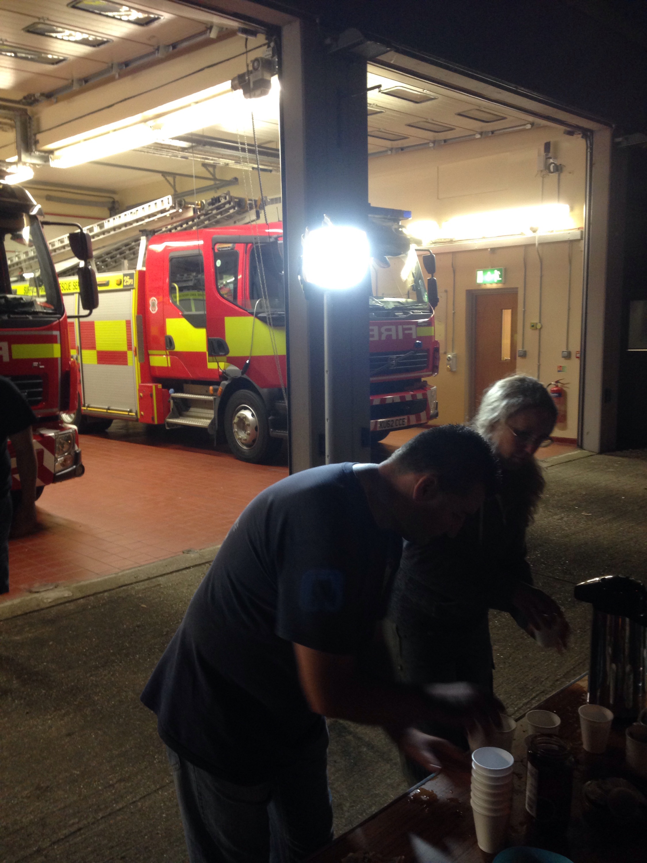 Around the corner I came to a fire station, which was selling tea, coffee, bacon rolls and good cheer. I bought a cuppa. It was freezing cold. I went back, and got another cuppa. I went for a wee in the station, and enjoyed the opportunity to glance at all the helmets.