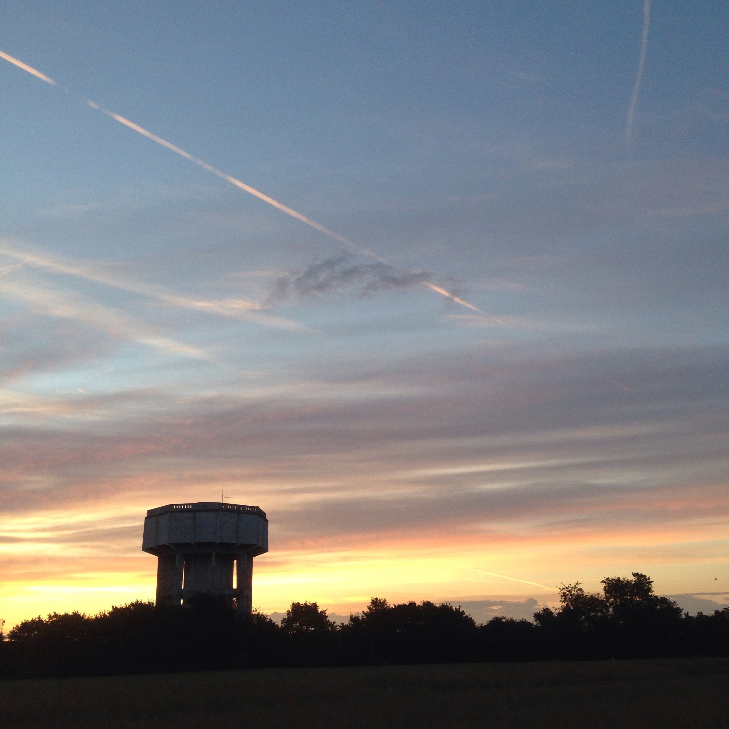 Back on the road. This was the hardest part of the trip, the bit where you start psychologically subtracting the last ten miles (because they “don’t count”) from your calculations. Only forty miles to go! Ish. That sort of thing. But then, the dawn had started, gloriously, to arrive, and this distracted me from the tiredness and the dangerously low number of cakes in my bag. The brutalist water towers that I’d fallen in love with the previous year loomed out at me in the early morning sun. An old cyclist was asleep in a ditch, and I met a woman lit up like a Christmas tree. Everything was getting increasingly surreal and glorious.