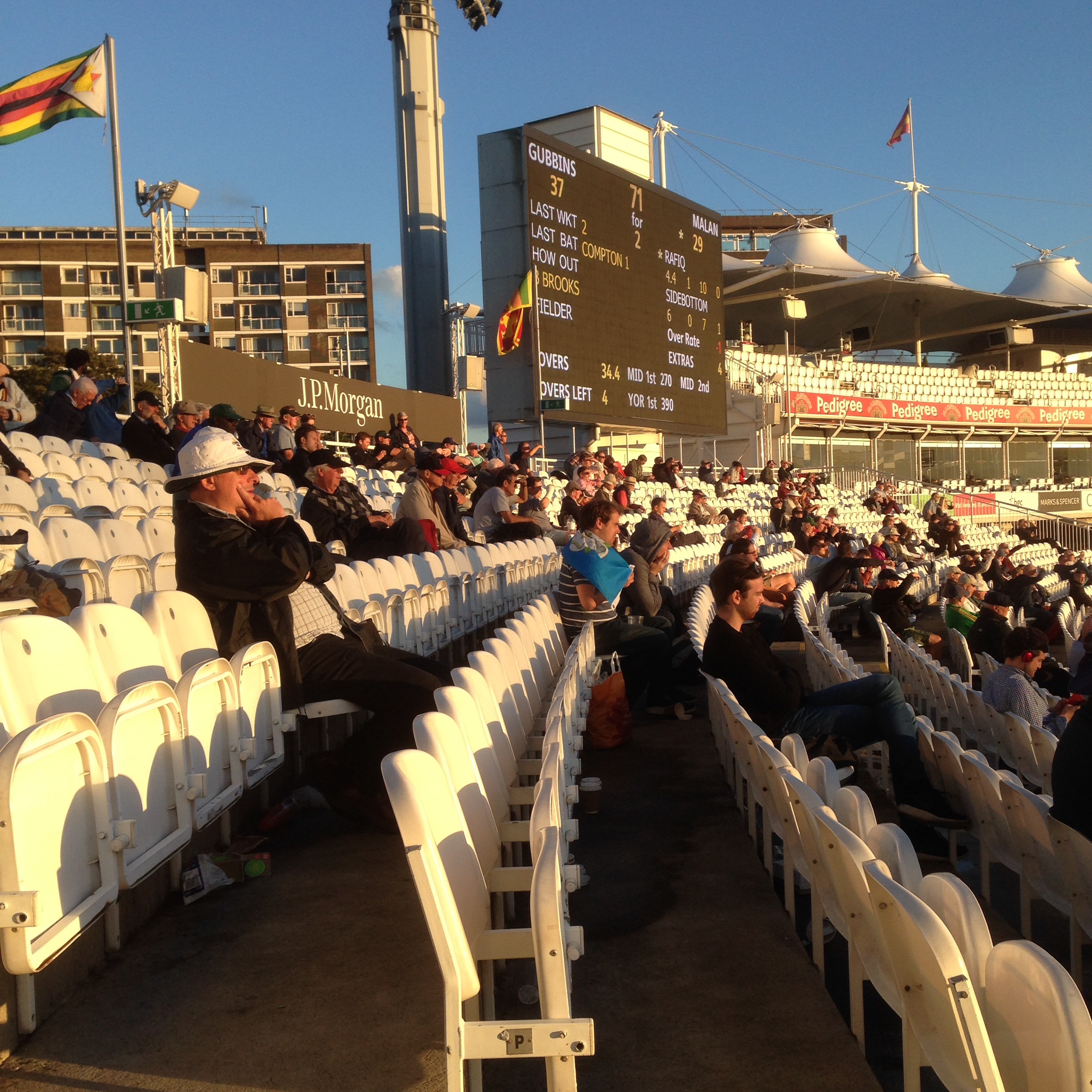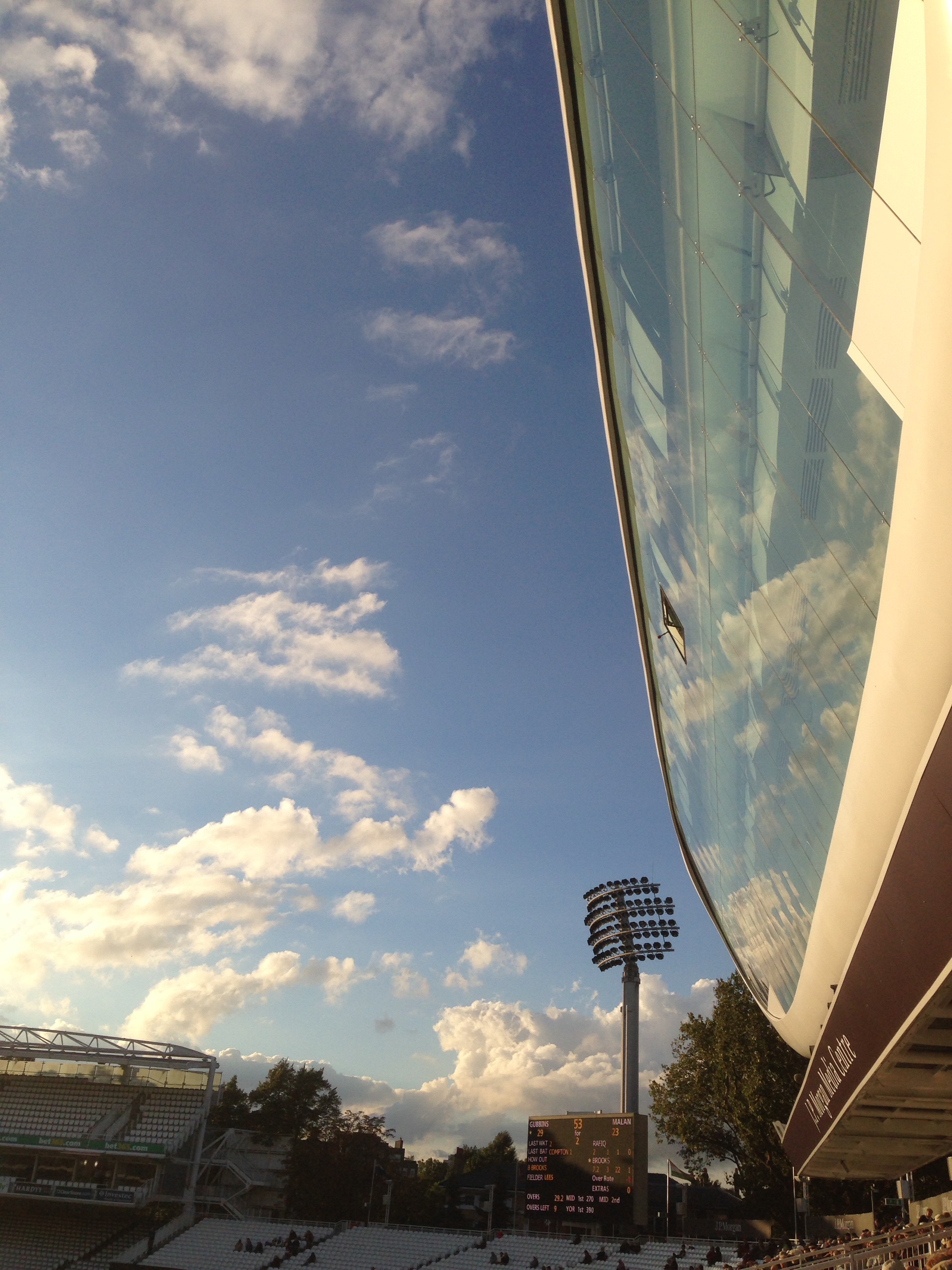 He was there with Chloe, his Strauss-loving friend, who was supporting Middlesex. I arrived around two, bringing rain which delayed play with Yorkshire on 349-9, one run away from the batting point they needed to stay in contention for the championship.