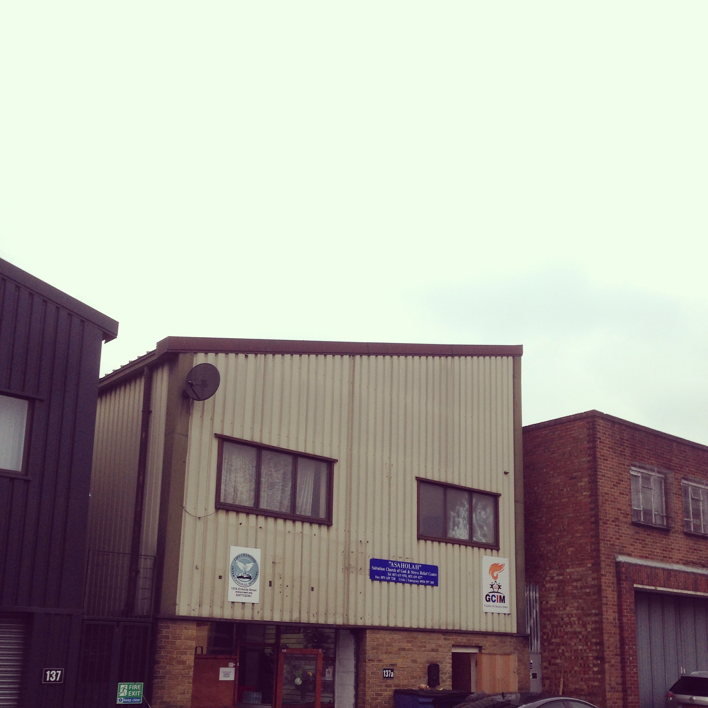 Just up from the Salvation Church of God & Stress Relief Centre, and next to a church represented by a logo incorporating an eye, a crown, and a cross, you will find the DIY Space for London, offering salvation of a different kind.