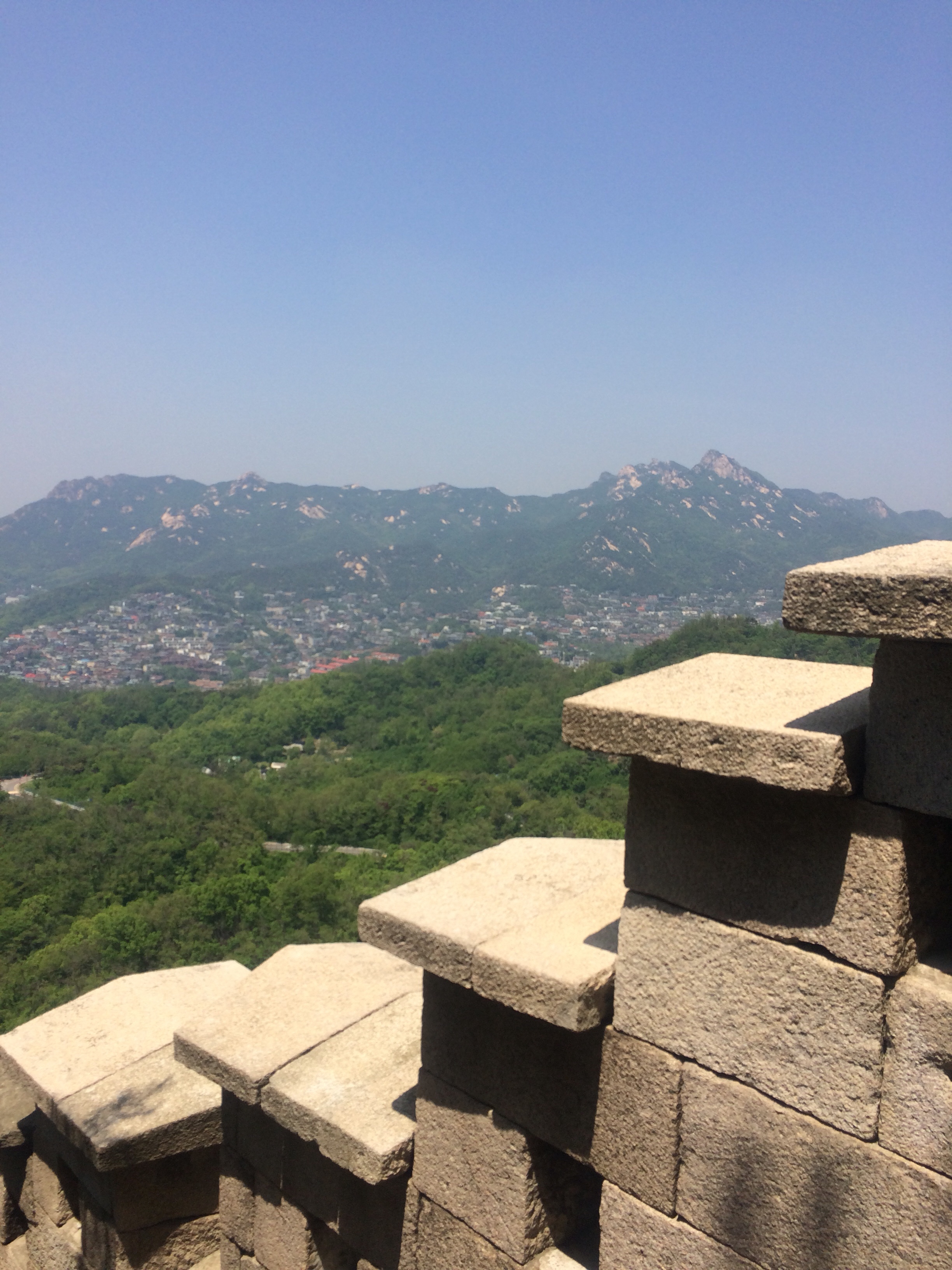 We got lucky. Half a mile further up, we were able to access a path as part of the old Seoul city wall. It was still part of a military installation, so we had to fill in a form, shown our passport, and wear a tag around our neck to stop anyone mistaking us for an invading army.