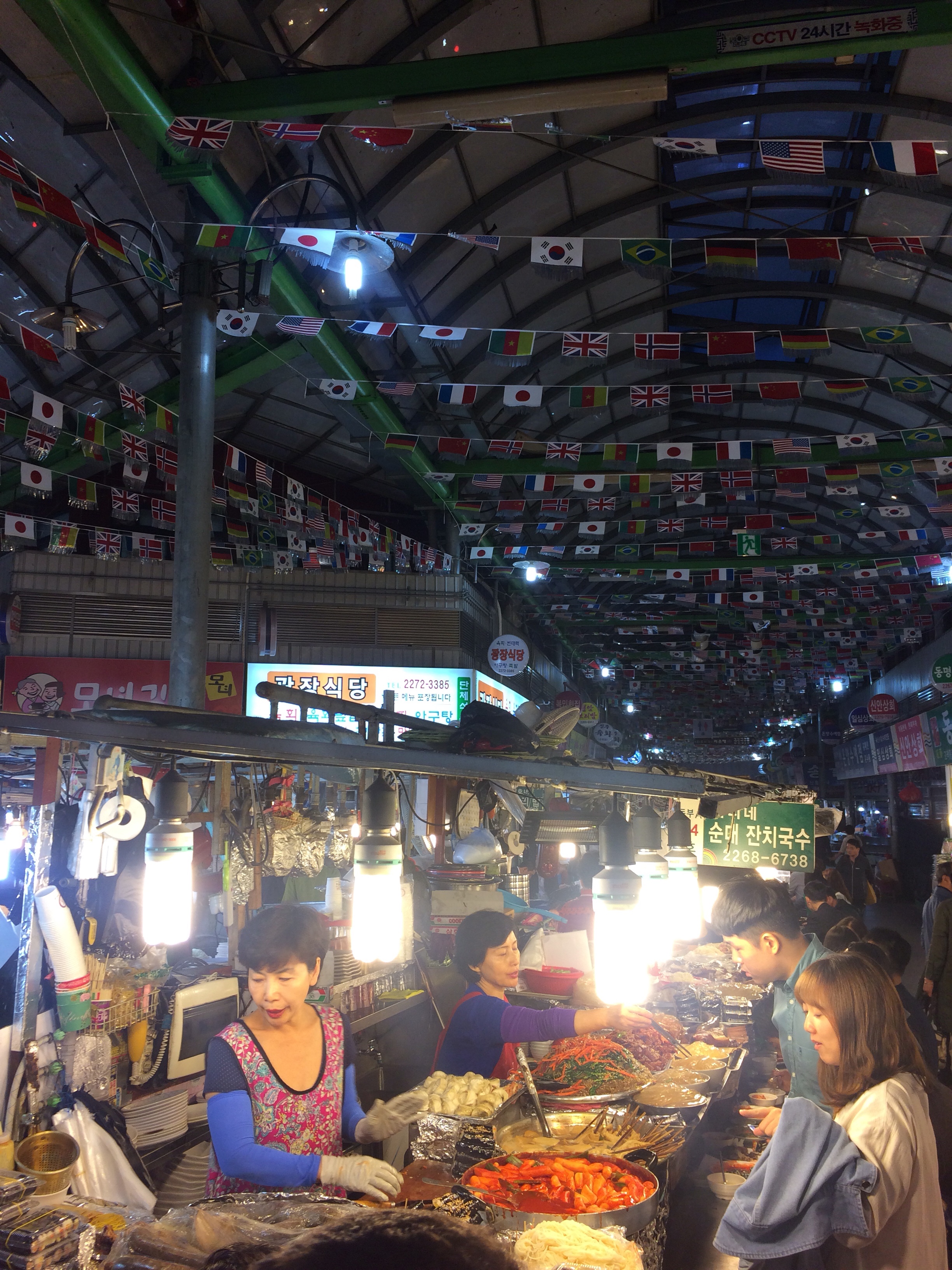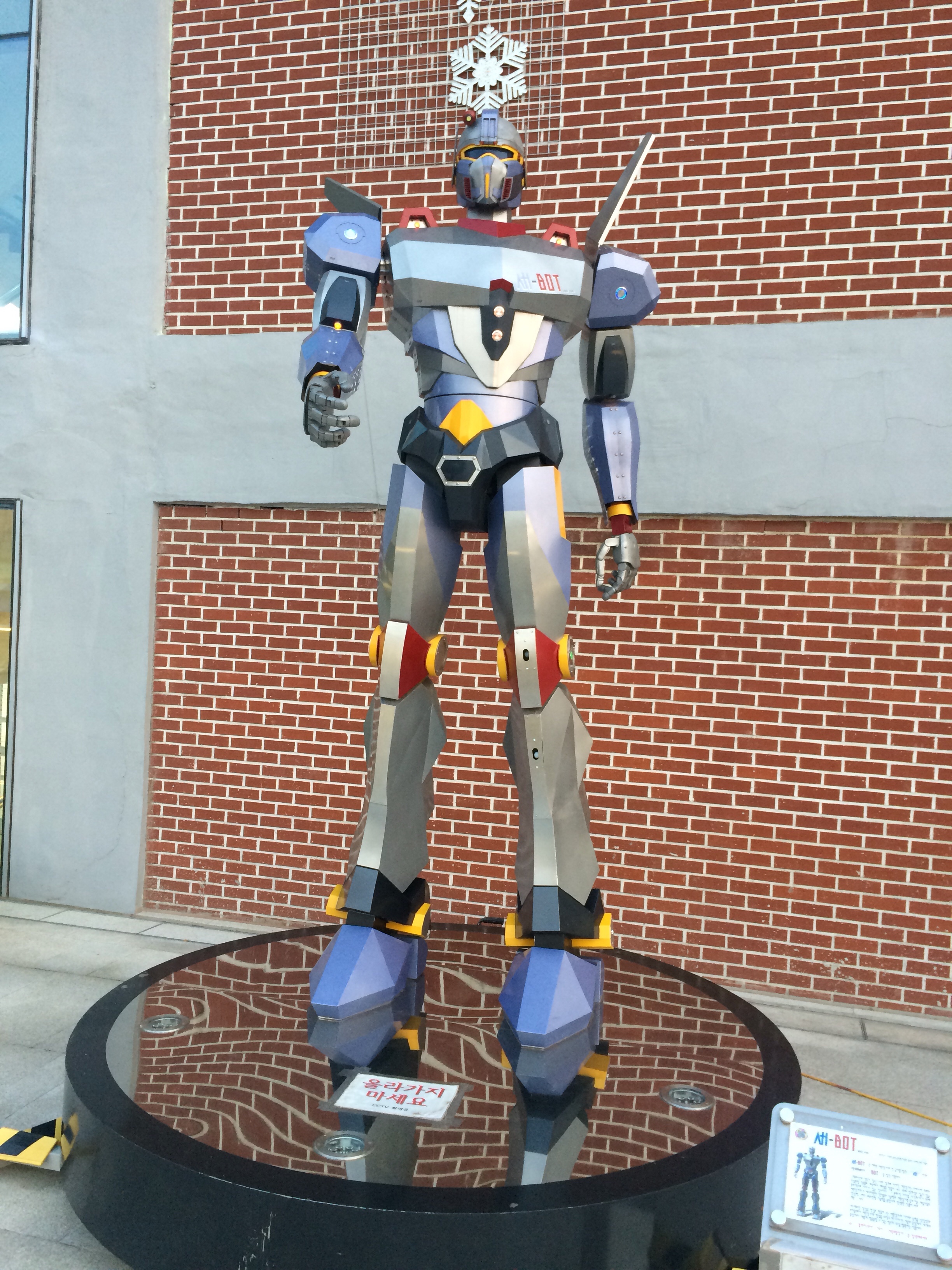 In the evening, we met a robot and had dinner in the Dongdawmun market. Dumbling soup and kimchi for us, though the multiple mung bean pancake stalls did look enormously tempting. Or “very delicious,” as one lady put it, coaxingly. Next time.