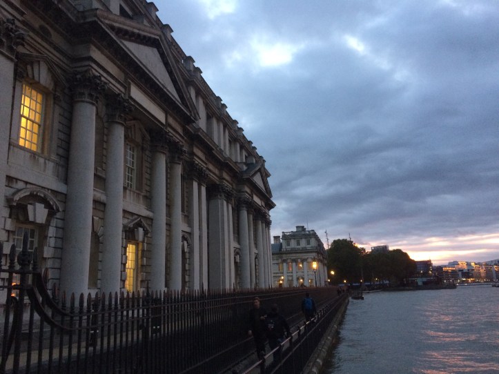 I then passed in front of the old naval college, pausing to enjoy the sight of the tide lapping the old stone steps. The sun was plotting its death dive below the horizon, and the water was speckled with red and yellow light. Two joggers passed.
