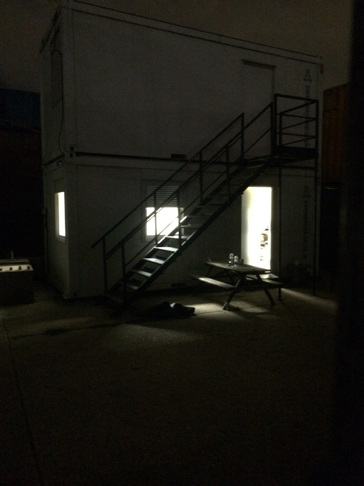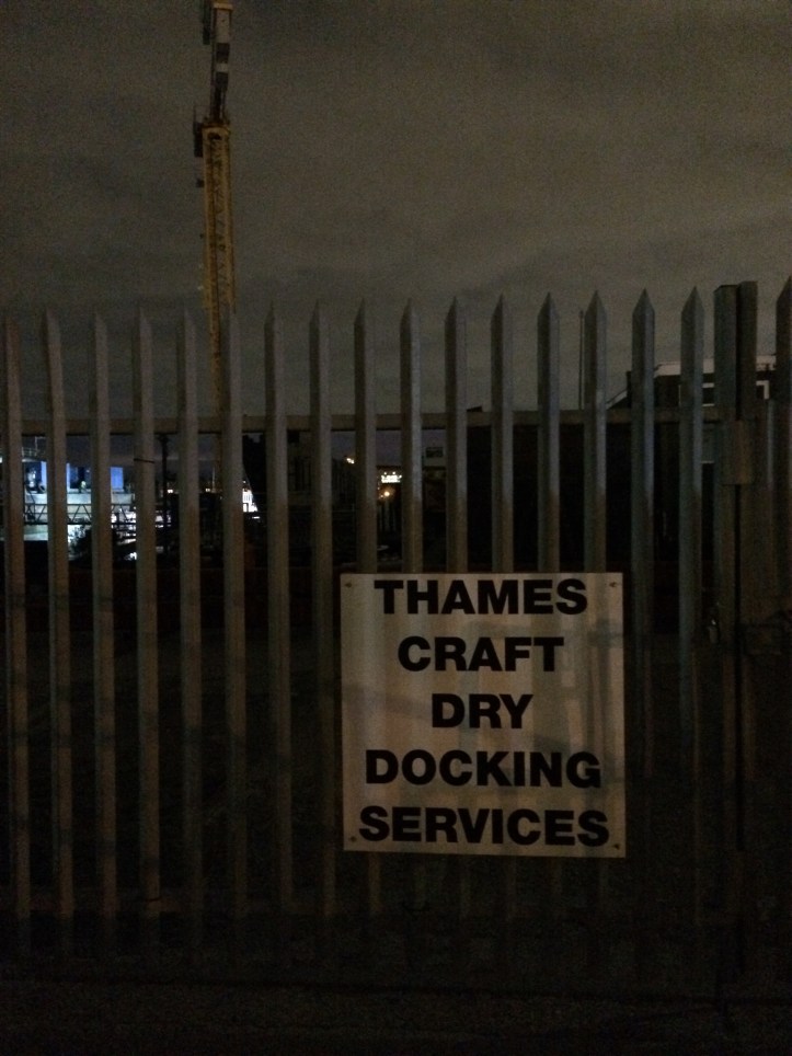 After heading through some trees hugging the river line, the path took me inland between high fences guarding wasteland and yards full of rubbish. There was one business that still seemed to be operating: a dry dock for thames river cruisers. I hadn’t seen a jogger or a fellow pedestrian since leaving the new development: here, I saw my first sign of human life in half an hour, a portacabin perched by the side of the dock bled artificial light; a kettle boiling. The shadow of a man shuffling around inside.