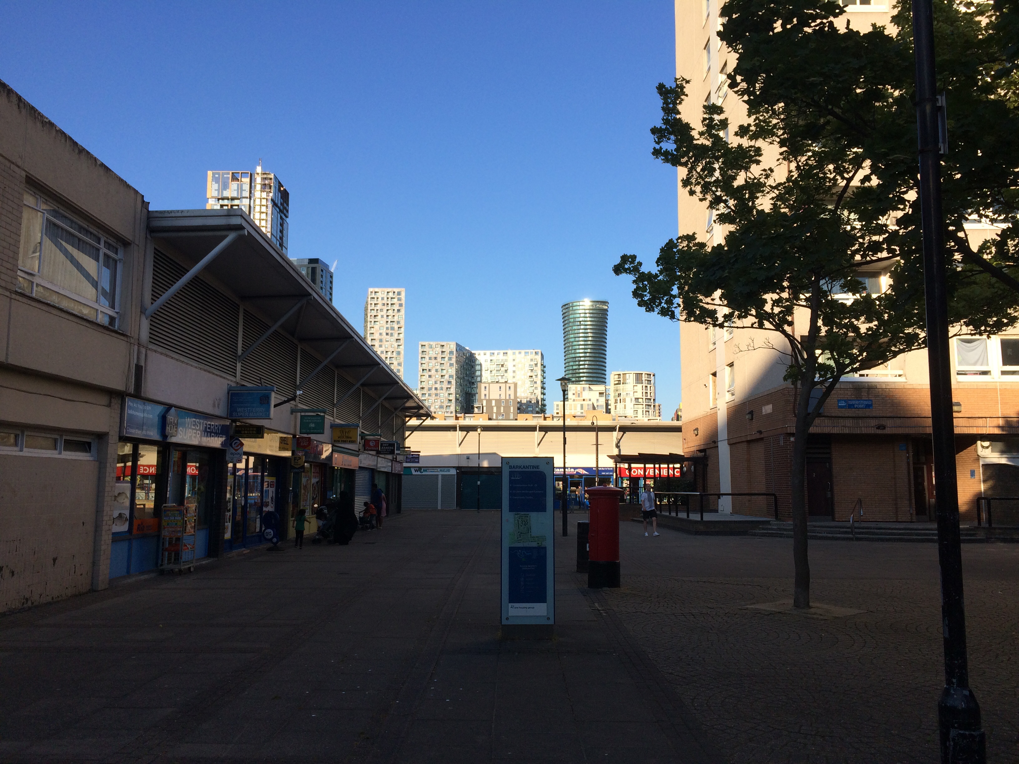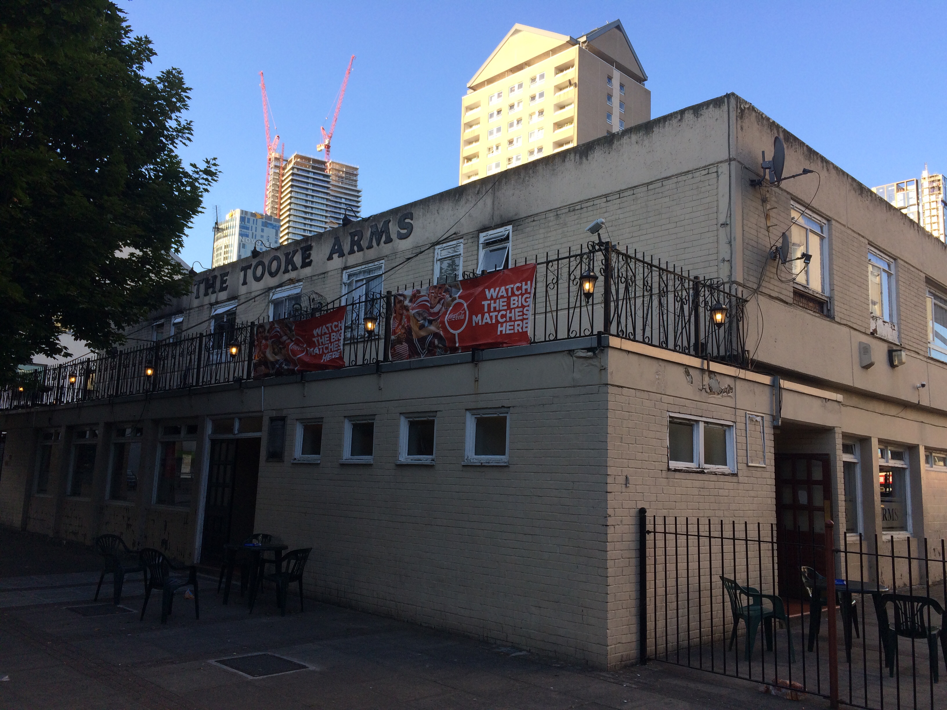 From Sir John McDougal Gardens we headed back inland, over a concrete footbridge to a postwar shopping precinct. And immediately relaxed: away from the apartment blocks and luxury marketing suites, here was a recognisable and familiar landscape. A chicken shop, a community centre. Even a 1970s estate pub, the Tooke Arms, which still – just – seems to be operating*.