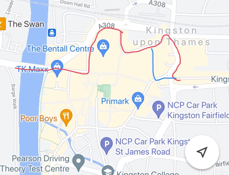 The route in red takes you along a shared path on the busy pavement outside Wilko’s, turns into a segregated cycle lane for a few hundred metres outside Pryzm nightclub, makes you wait to cross two sets of shared use traffic lights over the thundering urban motorway that surrounds and maroons Kingston station.