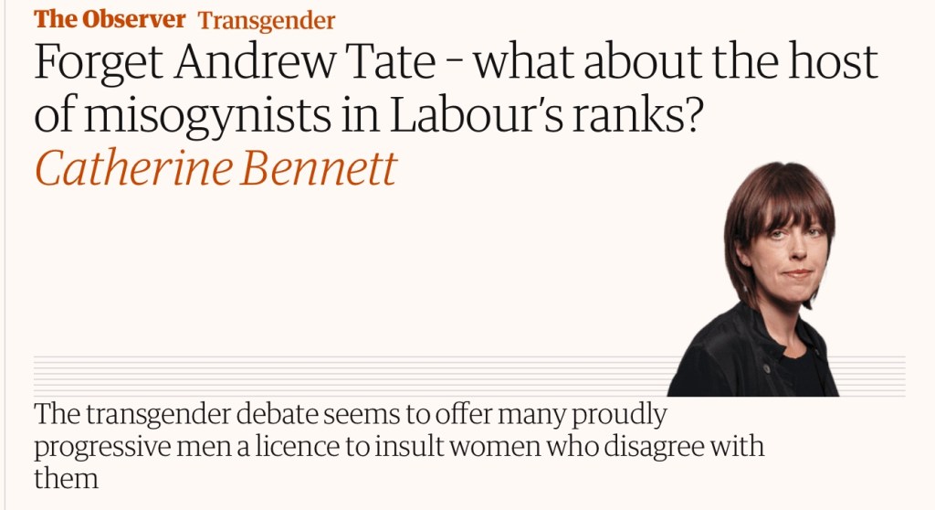 The latest article, by your columnist Catherine Bennett, attempts to parallel the activities of far-right online troll Andrew Tate with people in the Labour Party raising concerns about transphobia.