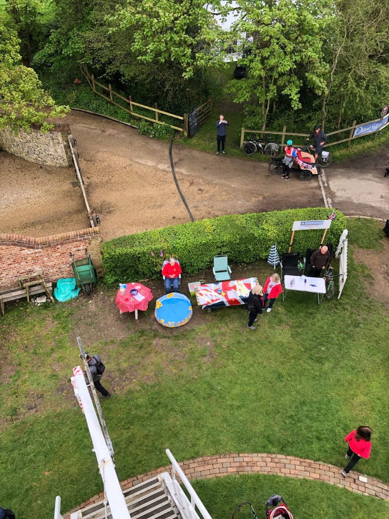 From here one headed up muddy footpaths between new build estates before finally emerging in open fields and the path to the windmill. Organisers had set up a cute park and ride with a minibus and even bunting-suffused pedal taxis, but I was in walking mode.