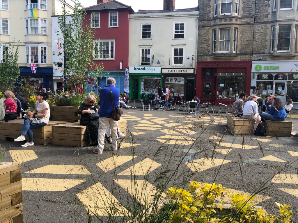And some space has clearly been recently reclaimed from cars in the city centre. One lovely example is Broad Street, where space that was once car parking is now plants, benches, and people.