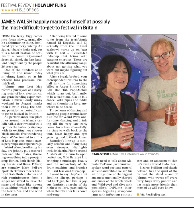 Johnny runs Lost Map records, purveyors of a dizzying roster of folk, electronica, and genre-bending experimentation; a miraculously sunny weekend in August marks their Howlin’ Fling, the best, and possibly the most-difficult-to-get-to* festival in Britain.