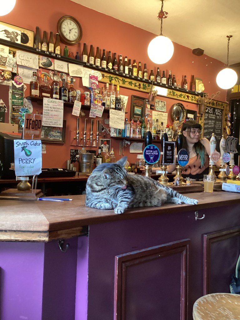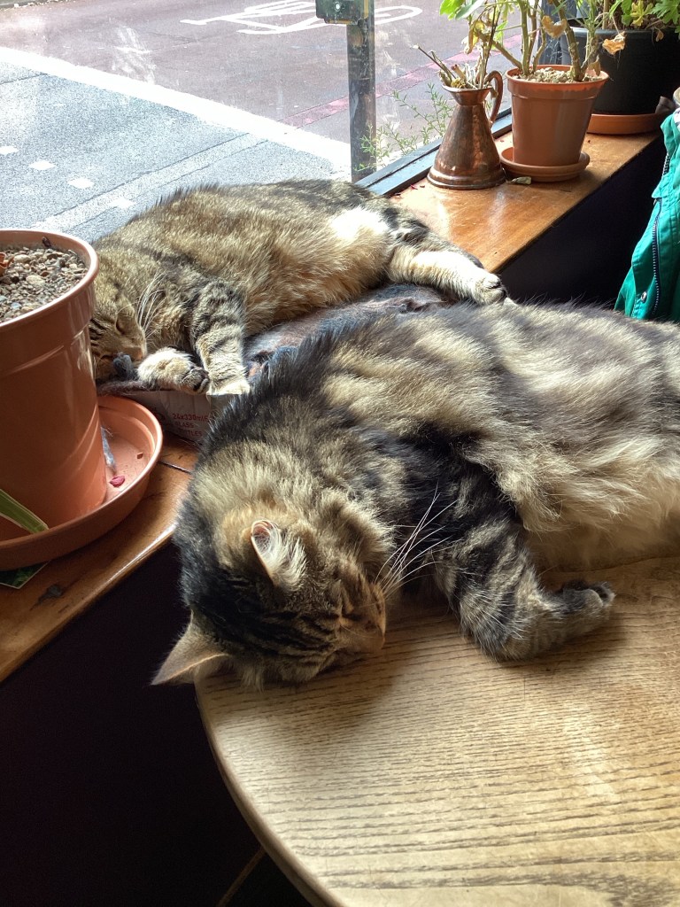 Usual pub operations happen around the cats; there are no cutesy cat toys or cat trees or other cat-pandering paraphernalia. There are some boxes that may once have contained crisps, that the cats have claimed as beds, and that’s about it.