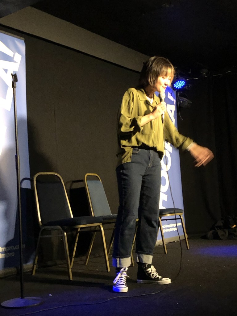 Crowd warmed up, or at least not entirely unhappy, I introduced our first act, the Chinese comedian Blank Peng, who wanted me to make it VERY CLEAR that she is a stand-up, not a sketch comedian. This I did.