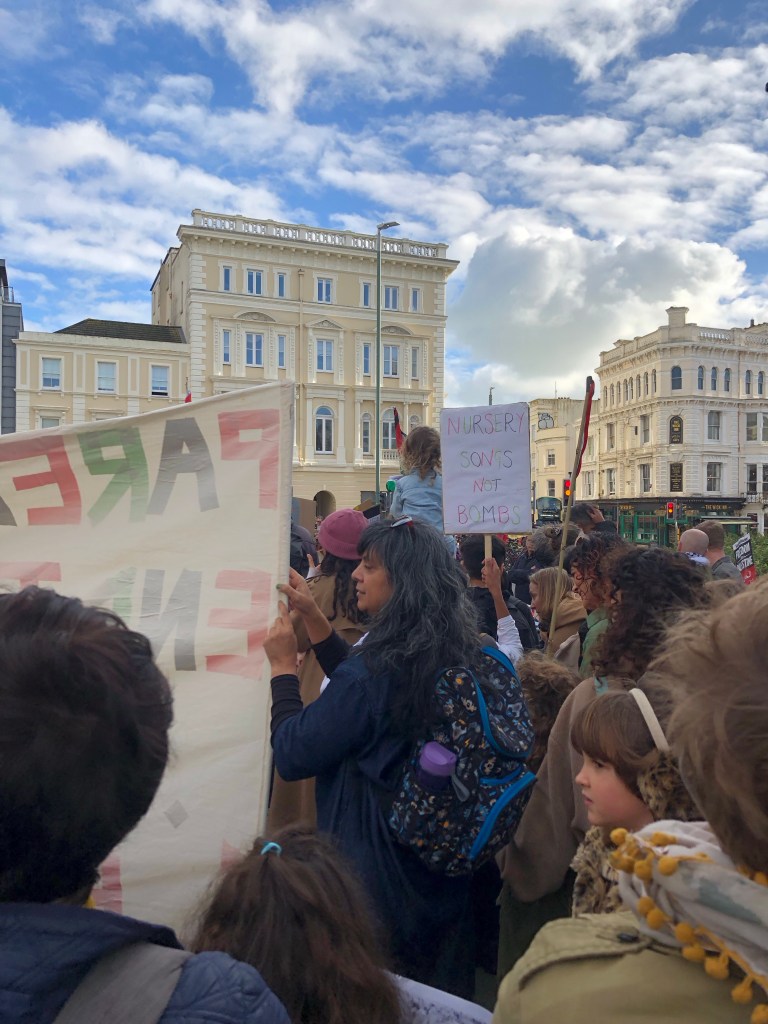 Shout out to Parents for Palestine, with their excellent bubbles, and to Acorn, the renter’s union, Sussex students, The Green Party, Extinction Rebellion, Stop the War, and many others for their support and their solidarity.