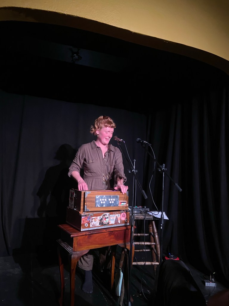 It was really lovely to meet some of my fellow performers, and I headed upstairs for the opening show. And I’m super glad I did: Claire Vine was an excellent singer, who wrote lots of lovely (and very lefty) loopy folk tunes, alongside well chosen covers by artists like Peggy Seeger. She should deffo follow her friends’ advice and get “Everything’s Vine” T-shirts made, as merch, and I bought her CD and am excited to listen to it, as soon as I buy a second hand CD player.