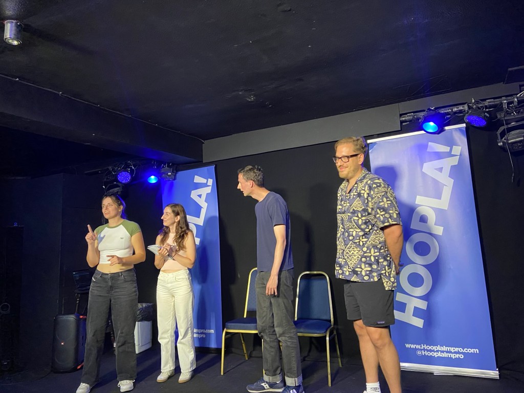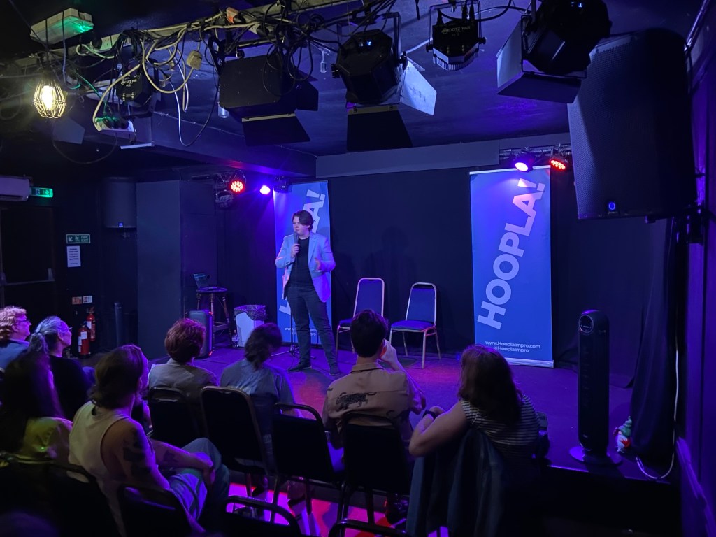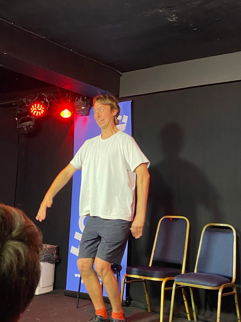 Closing the oh-god-is-it-already-9:15pm first half was the wonderful Kit Loyd, who bills himself as a one-man sketch comedy act but is, at heart, a brilliant physical comedian. I was a bit worried (that word again) that his stuff would be too similar to ours. I shouldn’t have – his was a masterpiece of gurning, timing, and very carefully timed and prepared musical prompts, expertly curated by… himself. Genuinely. He brought his own Bluetooth speaker. The tech – Dian, as by this point I was hiding in the audience – had absolutely nothing to do.